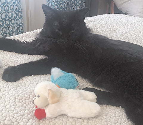By the way, I have my own side of the bed, complete with a special cat blanket and tiny toys such as my little lamb, my fish, my bird and even some feathers that lie still while I snooze. Mom says I do not snore, but that I am a very sound sleeper. Sometimes she says that I won’t wake up to sleep on her lap. It’s because I am just so comfy where I am. I don’t want to be jumping up and around the bed like she does. How I do love to relax.