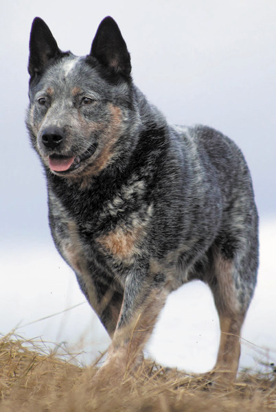 Bodie was obviously made from Heeler stock. He was silver-blue with a short scar on his right ear—which is probably why sometimes the tip of his upright ear pointed forward and gave him a slightly mischievous look. He was patient with our inspection and when he had had enough, he hopped past Pru a bit and sat with his back to the cautious pup.